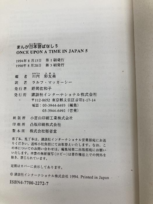 ■商品詳細■ 商品名・まんが日本昔ばなし―Once upon a time in Japan (5) 【講談社英語文庫】 講談社インターナショナル/ ■商品状態■表紙にスレ、ヤケ、シミ、キズ、ヨレ、強い水濡れ跡、傷み、天地小口にスレ、ヤケ、シミ、本にスレ、ヤケ、シミ、ヨレ、水濡れ跡、反り、歪み、等の劣化、強いイタミがあります。ご理解いただける方の購入お願いいたします。※注意事項※■毎商品チェック後出品しておりますが、中古品ということもあり、多少の書き込み等のチェック漏れがあった際はご容赦下さい。■付録等の付属品がある商品の場合、記載されていない物は『付属なし』とご理解下さい。■併売販売をしているため、在庫切れの場合はキャンセルとなります。予めご了承ください。