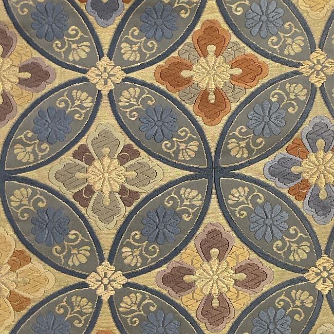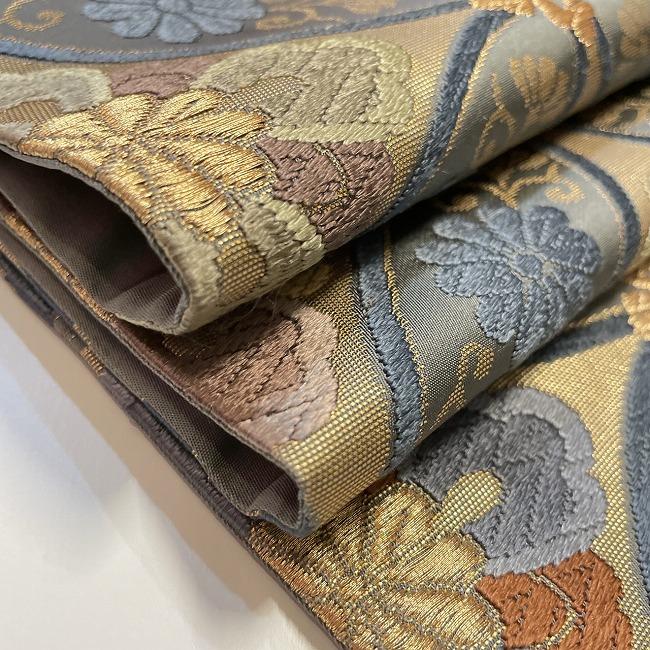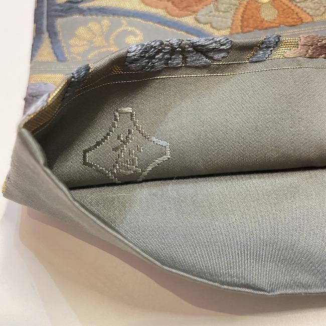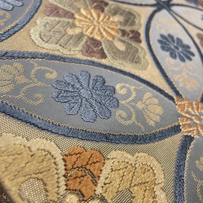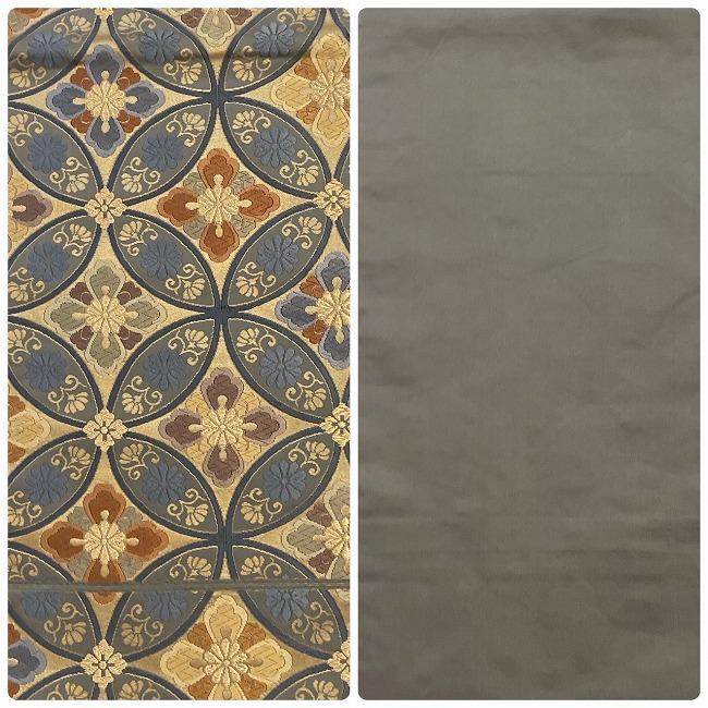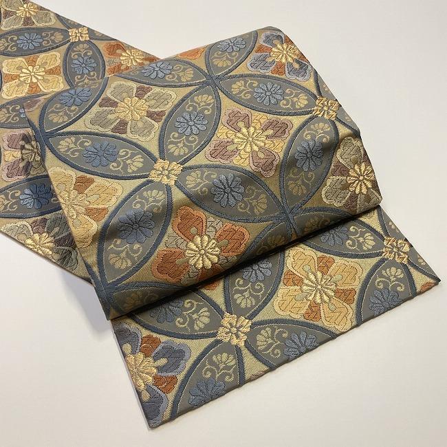 七五三や改まったお式におくゆかしい色合い。灰青色地に菱七宝のデザインが入った綺麗な袋帯です。七宝柄は永遠に繁栄がつづくという吉祥文様。お祝いの気持ちをこめた コーデにも向いています。フォーマルなコーデにお使いいただけます使用されていますが目立つ汚れ等はございません。振袖に合わせても素敵です。