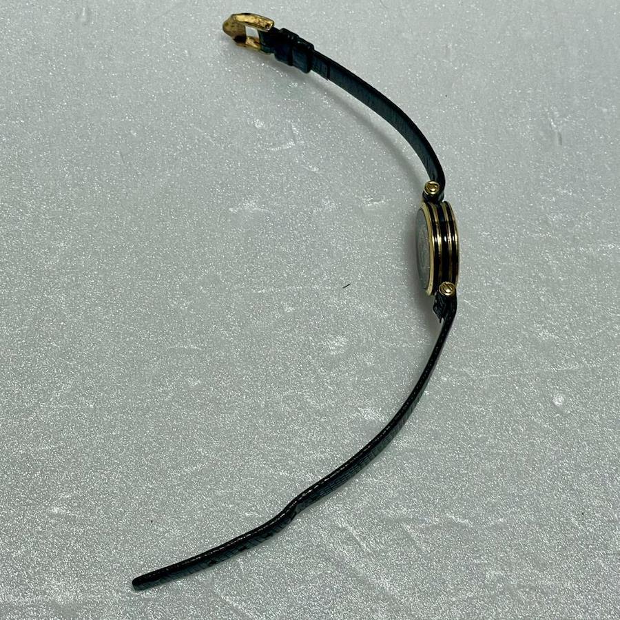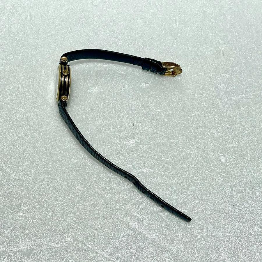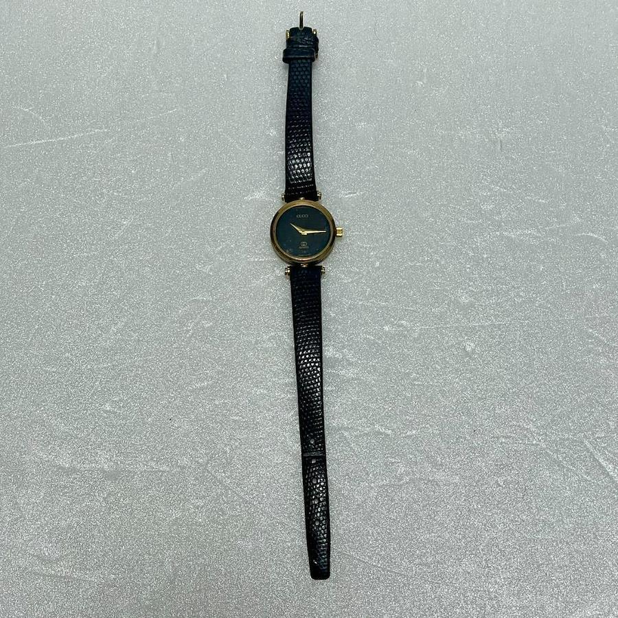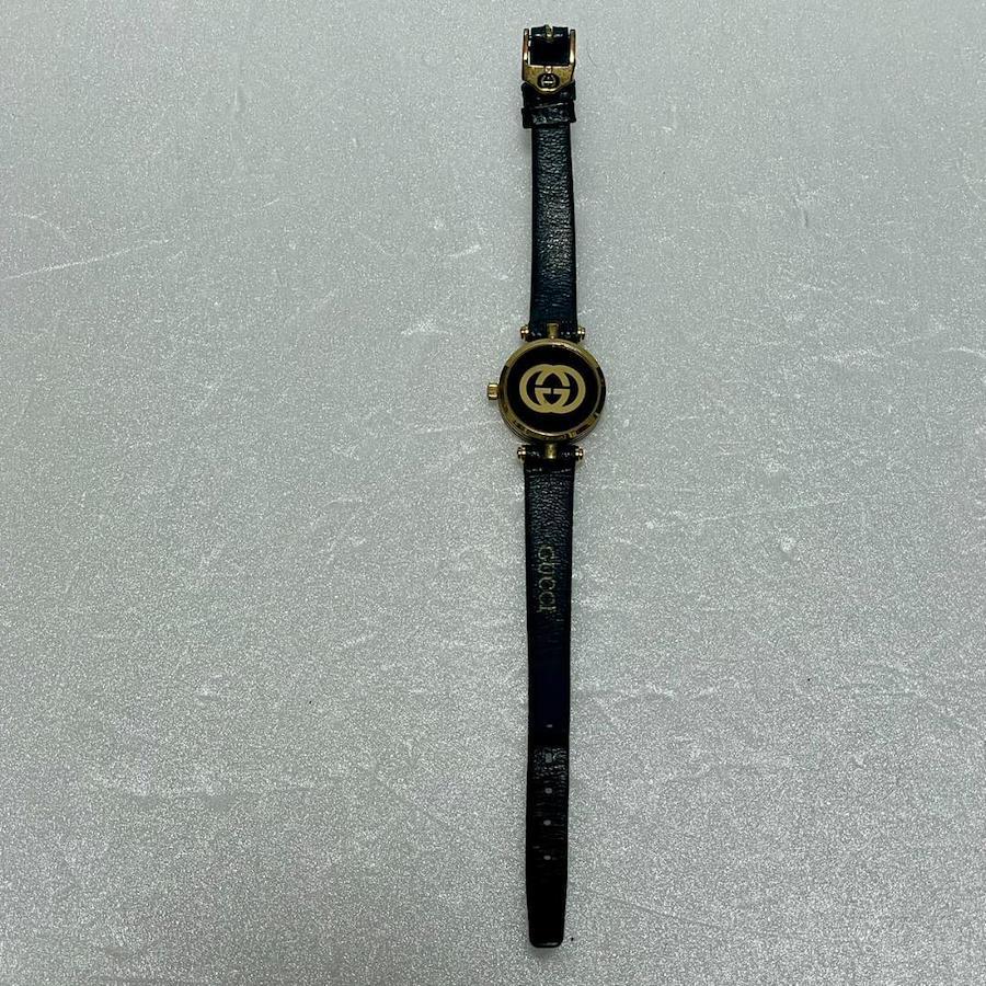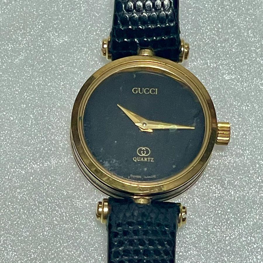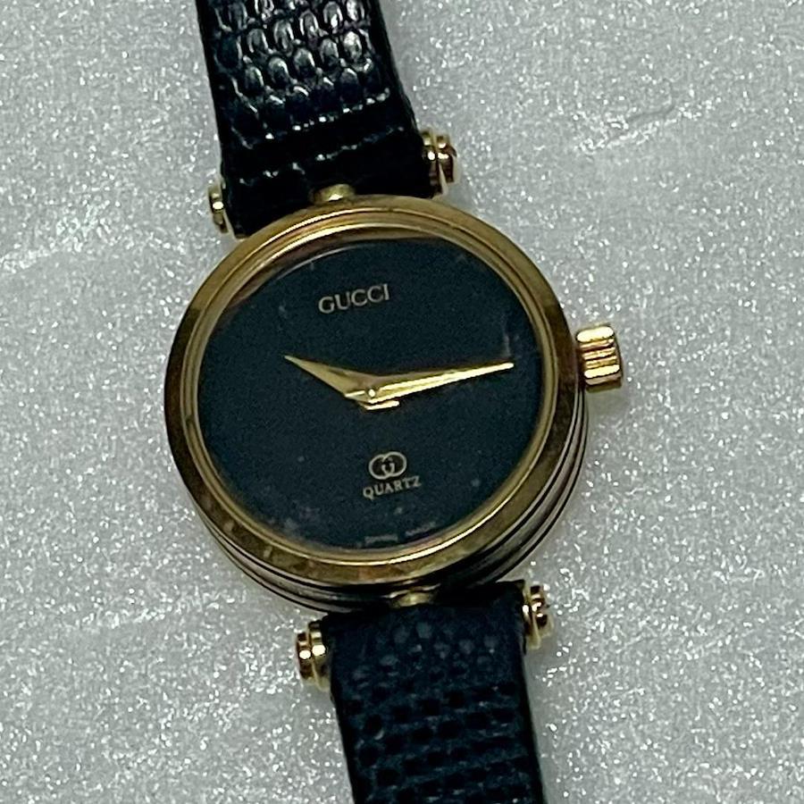 ブラックレザーのバンドとゴールドのケースが特徴のGUCCIのアナログクォーツ時計。
