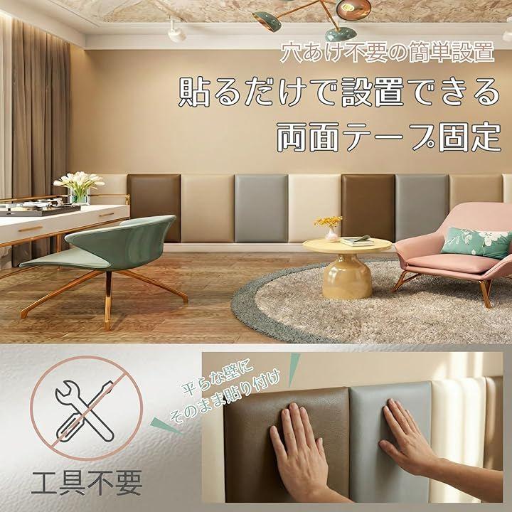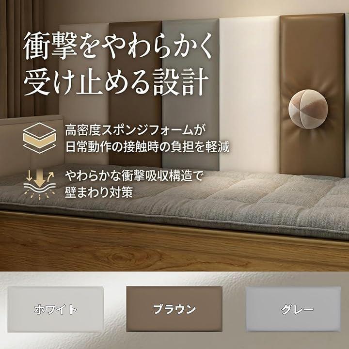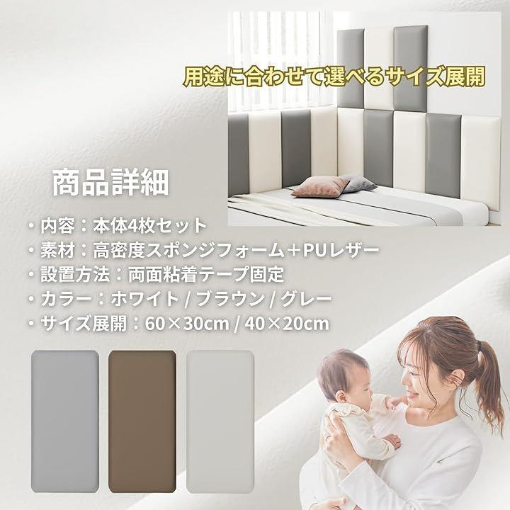 「商品詳細」 本体4枚セット 素材:高密度スポンジフォーム+PUレザー 設置方法:両面粘着テープ固定 カラー:ホワイト / ブラウン / グレー サイズ:60x30cm / 40x20cm