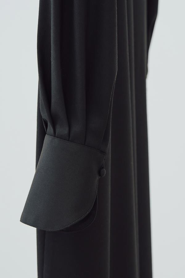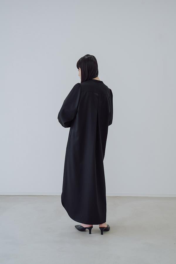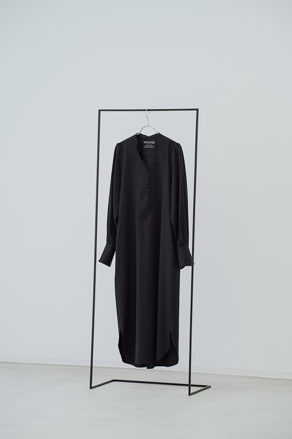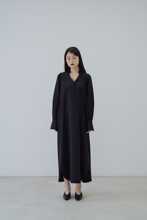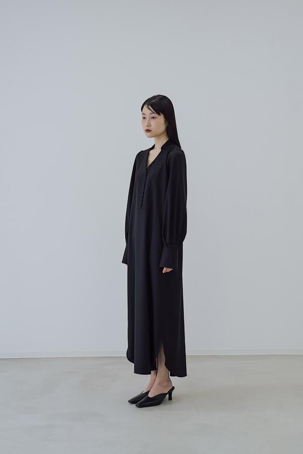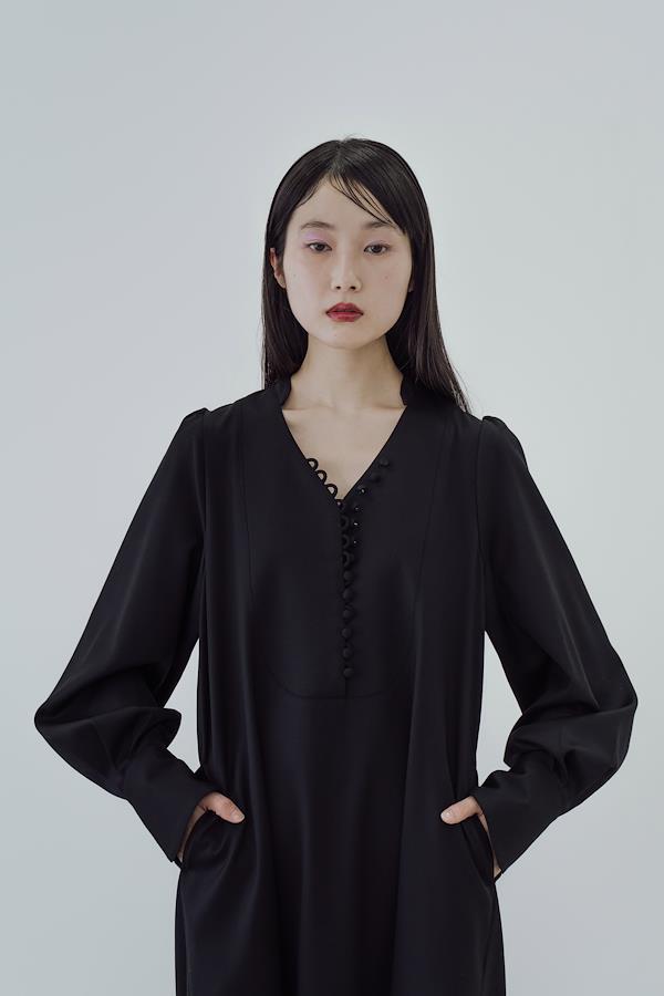 【ワンピースについて】造形的なIラインに美しいドレープを纏ったくるみボタンドレス。随所に施された曲線美が、柔らかく色気のある佇まい。スタンドカラーは首元を美しく縁取り、胸元の曲線的なカッティングはボタンの留め方を調整することで様々な着方を楽しめます。センシュアルでありながら日常に溶け込み、着るほどに余白を生み出すコンセプチュアルな1着。