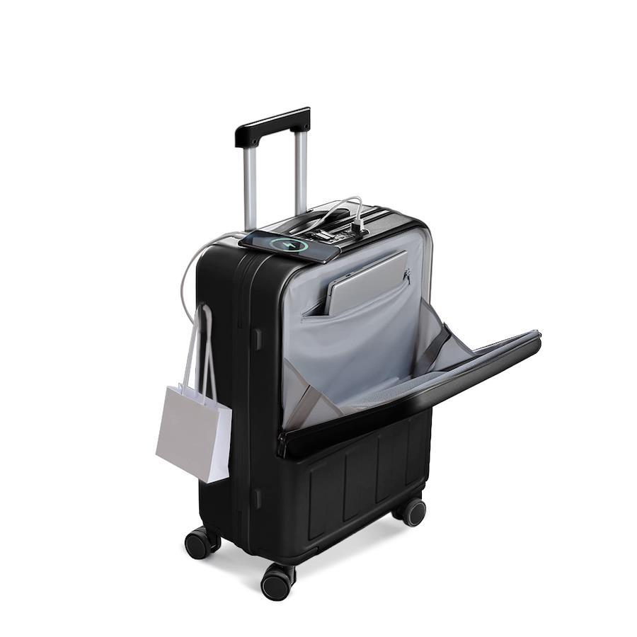 【製品仕様】】サイズ:約W40×D25×H54cm / カラー:ブラック / 重量:約3.4kg / 容量:約39.1L / 材質:ABS+PC(本体)、スチール(キャリーバー)【大容量でたっぷり収納できる】内装は両面開きのフロント側になる収納部にファスナー開閉式カバーを装着したコンパートメント(仕切り)設計。収納スペースを2つに分割する間仕切りを設けて、スーツケースを開けたときの荷崩れを予防します。内装には防水性に優れた素材が使用され、濡れたタオルや化粧品などビニール袋に入れずに、そのまま収納できます。【三層複合ABS・PCの構造】三層耐圧縮加工の柔軟で衝撃や変形に強いハイブリッド樹脂です。ボディは耐久性や耐衝撃性に優れたABS・PC樹脂の高品質素材。外部から衝撃が加わっても、内部の荷物をしっかりと保護します。ABS樹脂は軽くて弾力性と割れに強く、PC(ポリカーボネート)樹脂は耐衝撃性・耐熱性に優れる。両素材を配合した耐久性が高いハードタイプの高品質ボディを実現しています。usbポート付き&ダイヤルロック】便利なUSBポート付き。いつでもどこでも簡単に充電できる安心感!歩きながら、座りながら、仕事しながら、効率の良いライフスタイル。ロックは、ダイヤル式を採用。鍵の持ち歩きが不要なので、紛失の心配がないのも魅力です。【360°回転・静音キャスター】静音キャスターは360°回転で小回りが利いて滑らかに運べるため、夜中や住宅街でも周りを気にせず移動できます。4輪のダブルホイール構造は、荷重分散による衝撃の緩和とスムーズな走行を可能にします。