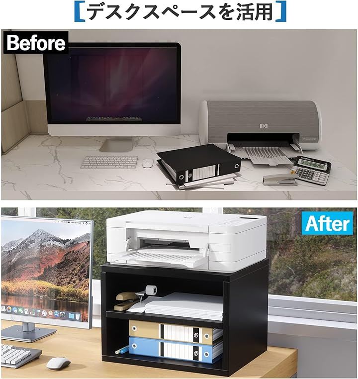 「デスクスペースを活用」プリンターが机のほぼ半分を占めていることに、机の上がオフィス用品や紙で山積みになっていることに困っていますでしょうか?こちらのプリンター台にお任せください。こちらのプリンタースタンドはプリンター本体から印刷用紙やインクまでひとまとめに収納できます。