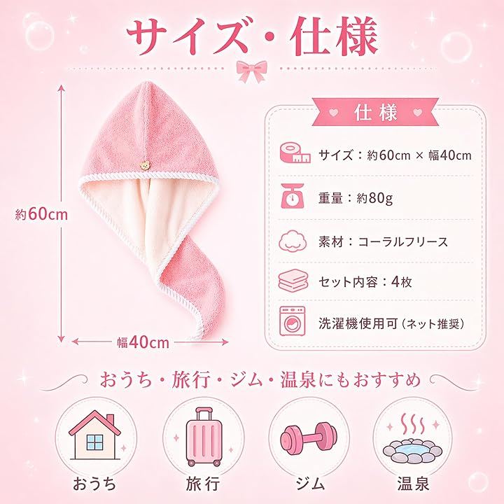 「かぶるだけ時短」ヘアドライタオルとして髪を包んで留めるだけで使える4枚セット。