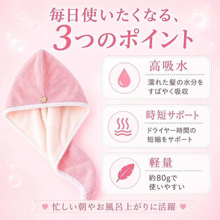 お風呂上がりの濡れた髪の水分をやさしく吸収し、ドライヤー時間の短縮をサポート。