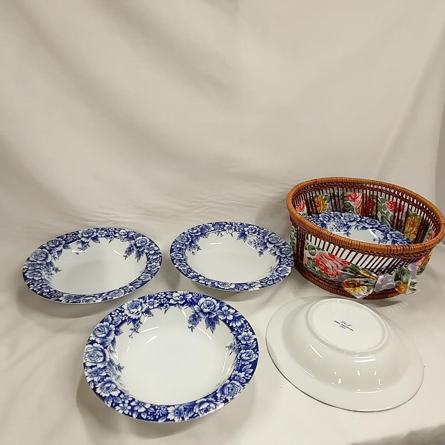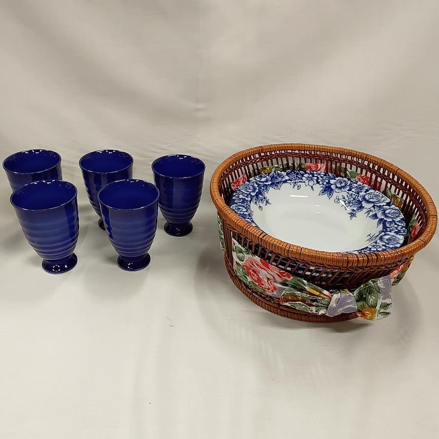 濃紺の美しいバラ柄の籠付きカレー皿とタンブラーのセットです。外箱のみ、経年劣化しています。(梱包のテープ跡、スレ)