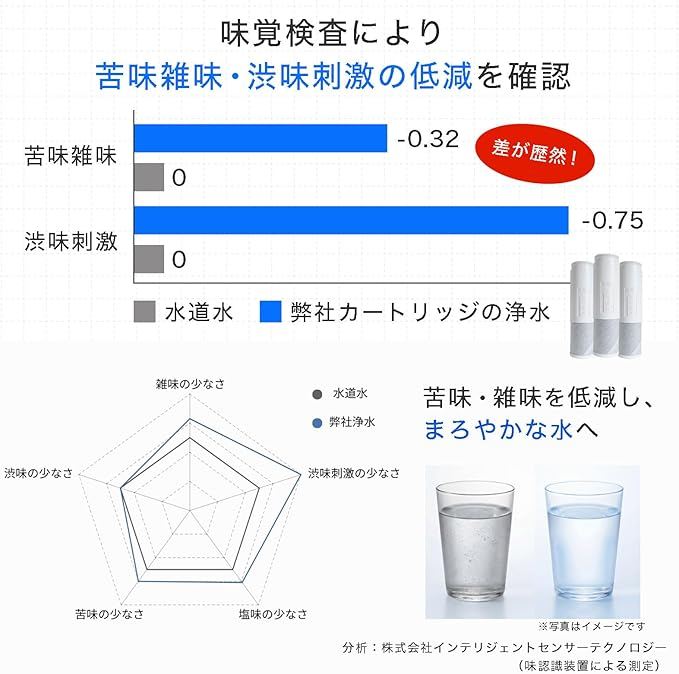 (遊離残留塩素、CAT、2-MIBカビ臭、溶解性鉛、フェノール類、ジェオスミン、陰イオン界面活性剤) ろ材の種類: 中空糸膜、イオン交換繊維、活性炭、不織布。