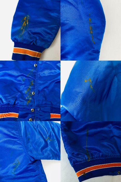 下部ぼたん周辺、袖裏、右袖下、左ロゴ下、背面部左下、右中に汚れあり。