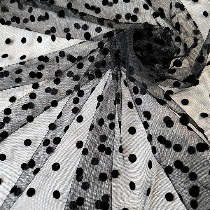 メッシュ地にフロッキーの水玉をあしらった(少し大きめのドットデザイン)、1way(横方向にストレッチ)ソフトチュール生地です。