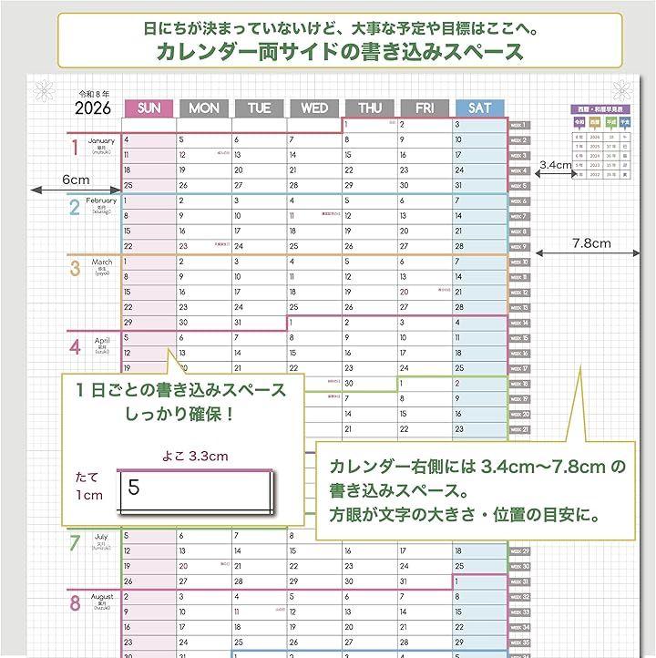 カレンダー両脇に書き込み自由なフリースペースを確保。