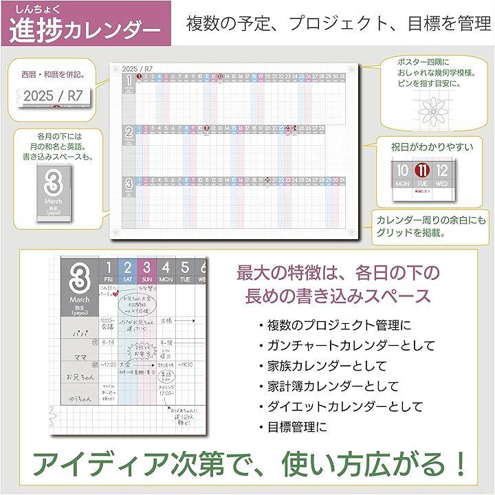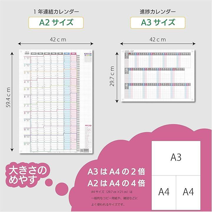 レイアウト次第で3か月~1年を見渡せる、A3サイズの進捗カレンダーと、A2サイズの1年連結カレンダー。