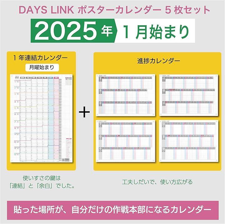 1年連結カレンダー・月曜始まり(1枚)と、進捗カレンダー(4枚)。