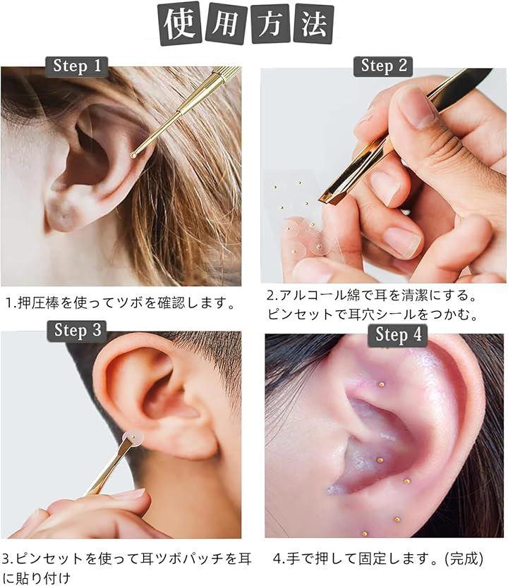「パッケージ内容」耳つぼシール100粒(このセットには耳つぼジュエリーのみが含まれており、ピンセットや耳穴確認棒は含まれておりません。