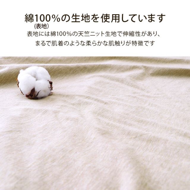綿100%の天竺ニット生地で伸縮性があり、まるで肌着のような柔らかな肌触りが特徴。1年間季節を問わずご使用いただける素材です。綿は通気性吸水性ともに優れている素材です。汗をしっかりと吸収し、すばやく発散する性質を持ちます。そのため、蒸れにくくサラサラとした状態を保ってくれます。綿素材なので冬場の乾燥した季節でも静電気が起こりにくいです。中綿入りキルティング仕様なので、程よいクッション性があり快適な眠りをサポートします。裏の四隅ゴムバンドは、敷き布団やマットレスにも対応可能。お洗濯可能でいつでも清潔にご使用いただけます。(洗濯ネット使用)※綿特有の臭いがする場合がございますが、ご使用につれて徐々に薄れていきます。※綿素材の特性上、生地表面に多少毛羽落ち、毛玉が発生いたします。※綿素材の特性上、生地表面に綿の殻が小さく残っている場合があります。"