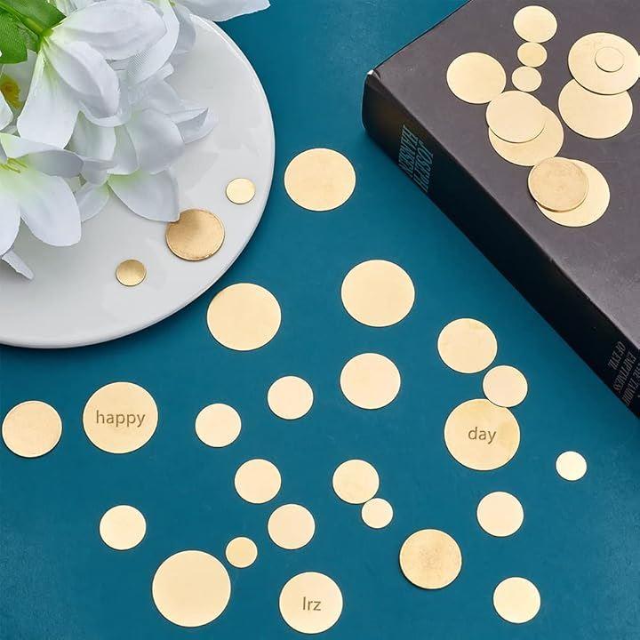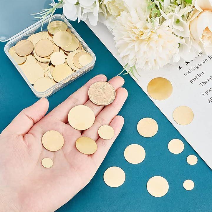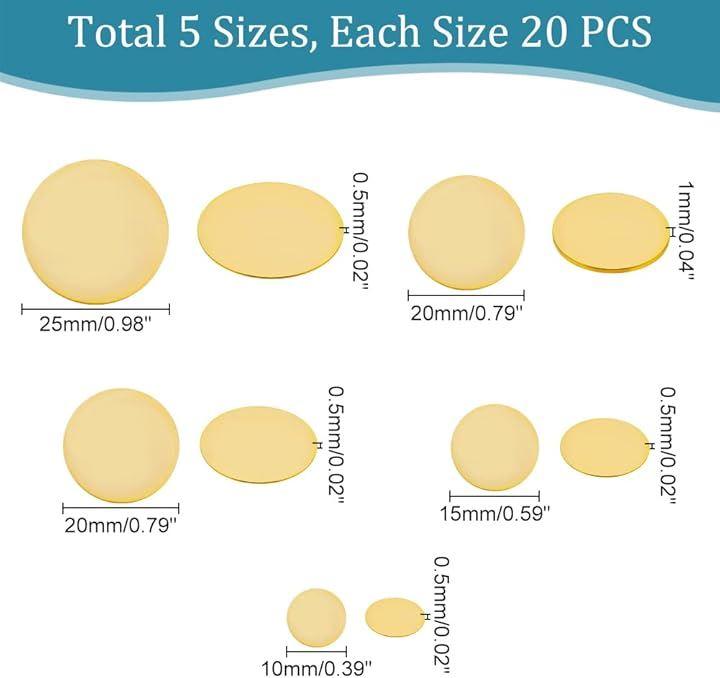 仕様: 数量:100個 材質:真鍮 サイズ: 平らな円形:約10x0.5mm、20個; 平らな円形:約15x0.5mm、20個; 平らな円形:約20x0.5mm、20個; 平らな円形:約25x0.5mm、20個; 平らな円形:約20x1mm、20個。