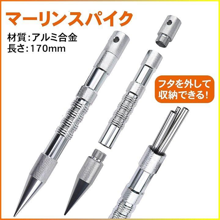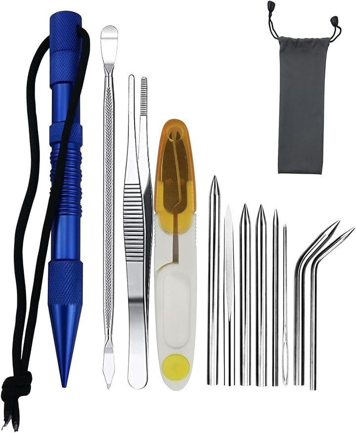 パッケージ内容(防水布バッグ入り/各1個):マーリンスパイク、大きな目の鈍い針、71x3mmのカーブニードル、71x5mmのカーブニードル、78x3mmのストレートパラコードレースニードル、78x5mmのストレートパラコードレースニードル、78x6mmのストレートパラコードレースニードル、フラットヘッドパラコードニードル80x5mm、パラコードレースニードル90x5 mm、パラコードスムージングツール172x8mm1、ピンセット、U字型はさみ