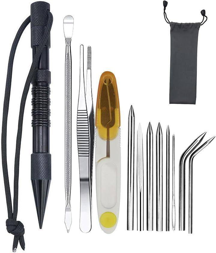 パッケージ内容(防水布バッグ入り/各1個):マーリンスパイク、大きな目の鈍い針、71x3mmのカーブニードル、71x5mmのカーブニードル、78x3mmのストレートパラコードレースニードル、78x5mmのストレートパラコードレースニードル、78x6mmのストレートパラコードレースニードル、フラットヘッドパラコードニードル80x5mm、パラコードレースニードル90x5 mm、パラコードスムージングツール172x8mm1、ピンセット、U字型はさみ