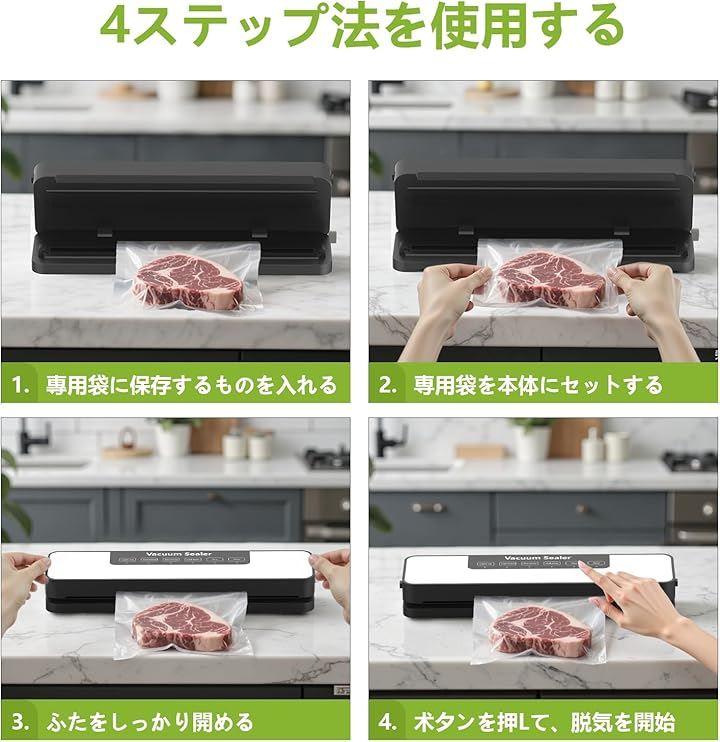 「自動モードで簡単操作」両側のボタンを押して真空パック機を開け、専用袋を真空槽に平らにセットします、次に、蓋の両端を押さえて「カチッ」とはまるまで固定し、自動ボタンを押すと、約26秒で「脱気+シール」が完了、シールのみの場合は約7秒で終了、簡単に真空保存の効果を実現できます