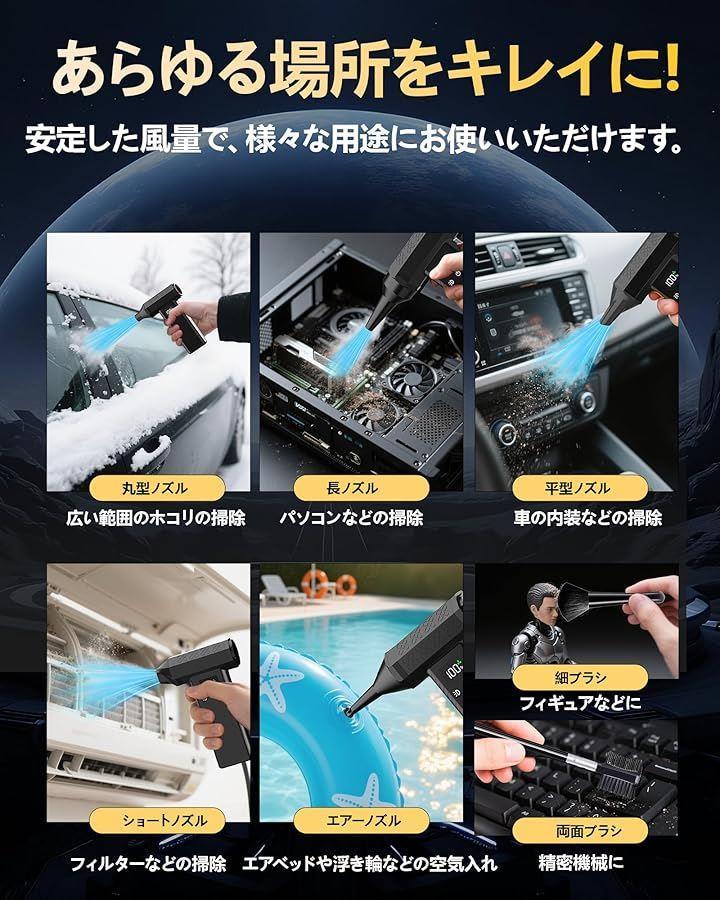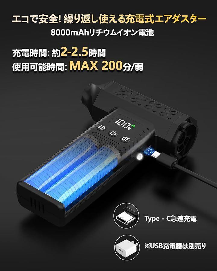 「100%真鍮超強力ブラシレスモーター&8000mAh大容量バッテリー&急速充電可能」アップグレードされた超強力モーターを採用、コンピュータやその他のデバイスの隅々からほこりを吹き飛ばすことができます。