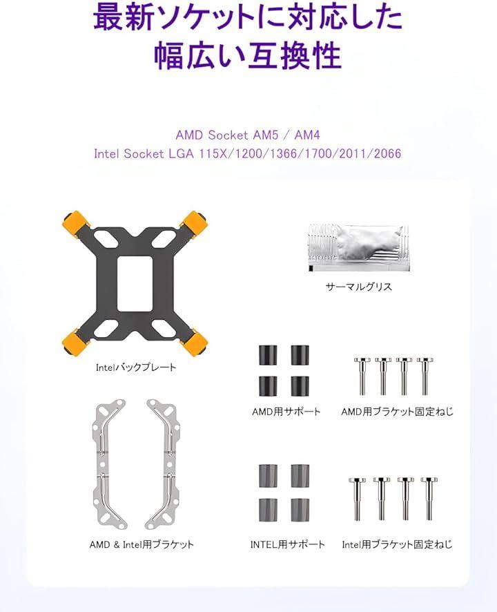 「幅広い互換性」LGA1700/1200/115X、AMD AM5/AM4ソケットに対応しており、最新のCPUにも適用可能です。