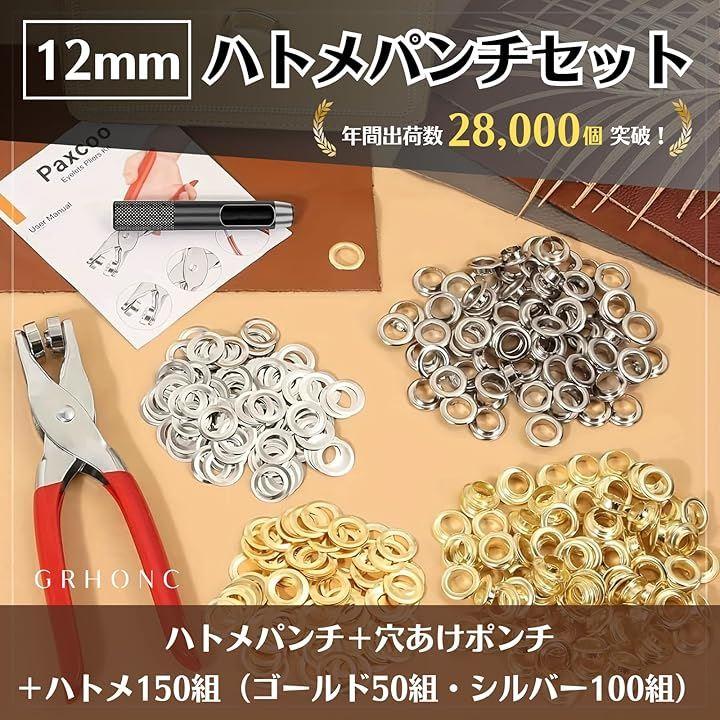 「年間2.8万個出荷。すぐに使えるハトメパンチセット」12mmハトメパンチ・穴あけポンチ・ハトメ150組(ゴールド50組・シルバー100組)の豪華セット。