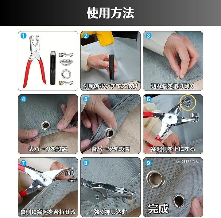 「セット内容」12mmハトメパンチx1・穴あけポンチx1・12mmハトメ150組(ゴールド50組・シルバー100組)「用途」ブルーシート・カーテン・バッグ・帽子・靴・ベルト・レインコート・テント・自転車カバー・裁縫・手芸・レザークラフト・DIY など