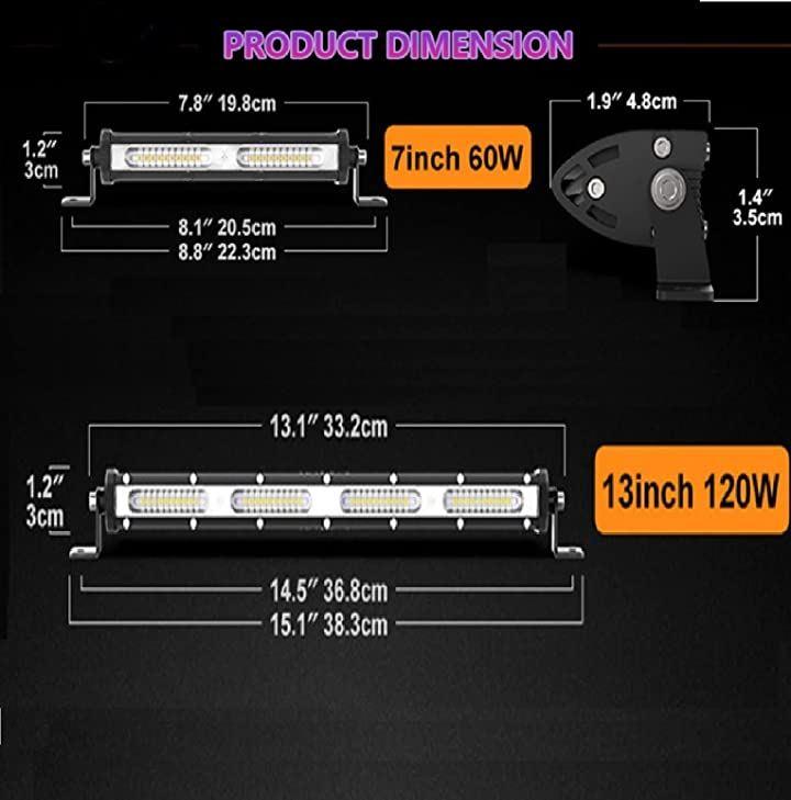 ・製品仕様:7インチ仕様(13インチ仕様) 本体幅19.8cm(33.2cm) 本体高さ3cm 本体奥行4.8cm 取付状態 幅22.3cm(38.2cm) 高さ3.5cm 奥行4.8cm LEDバルブ寿命: 30000時間以上 使用環境温度: -40°~ 85°