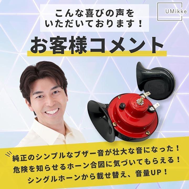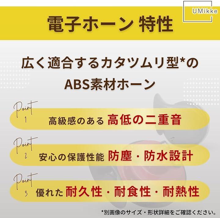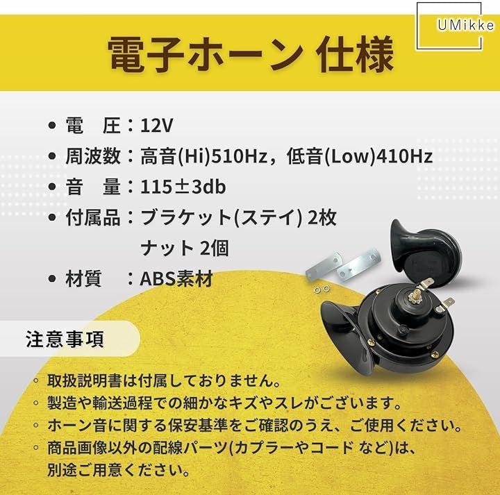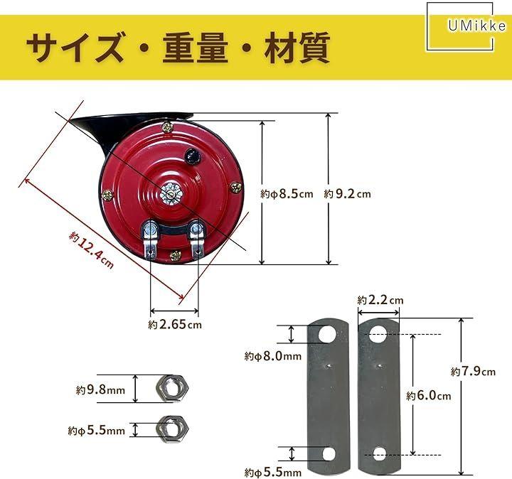「電圧」12V、 「周波数」高音(Hi)510Hz、低音(Low)410Hz、 「音量」115±3db、 「サイズ・重量」最長部約12.4cmx約9.0cmx約9.0cm、約395g *適合照会はいたしかねますので、サイズの詳細画像にて専門家にご確認ください。