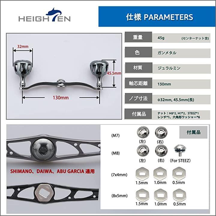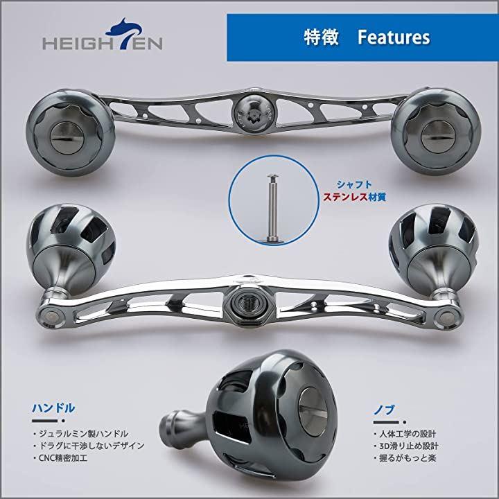 HEIGHTENリールハンドル高精度CNCマシンカット加工高品質70シリーズアルミニウム素材で軽く、強く仕上がっているダイワ(Daiwa)、シマノ(Shimano)、アブかルシア(AbuGarcia)に取り付けが可能人体工学と滑り止め設計でグリップ感が体感できる、質感も良くハンドル部のステンレス材質ベアリングも精度良く回転、手にフィットするノブに変えることで、コントロール性能が上がり、一日中巻いても疲れない。