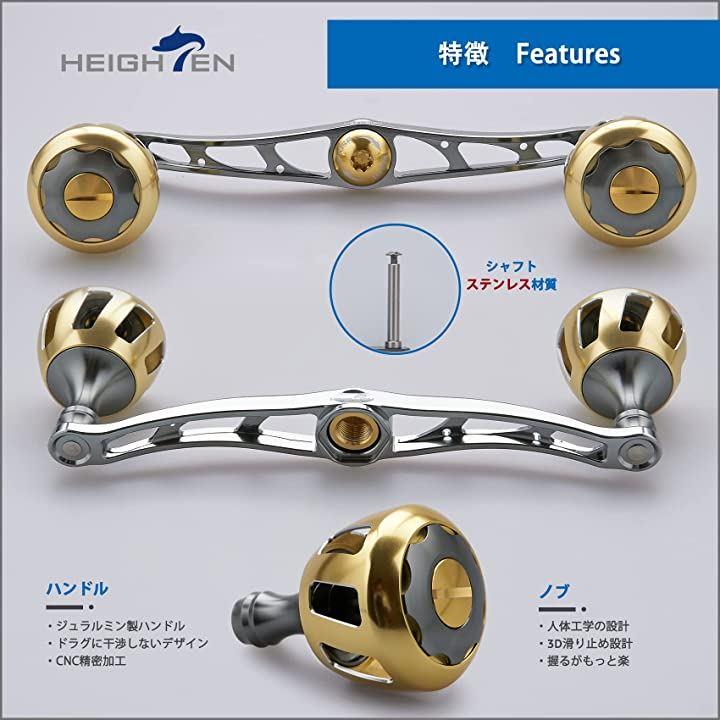 HEIGHTENリールハンドル高精度CNCマシンカット加工高品質70シリーズアルミニウム素材で軽く、強く仕上がっているダイワ(Daiwa)、シマノ(Shimano)、アブかルシア(AbuGarcia)に取り付けが可能人体工学と滑り止め設計でグリップ感が体感できる、質感も良くハンドル部のステンレス材質ベアリングも精度良く回転、手にフィットするノブに変えることで、コントロール性能が上がり、一日中巻いても疲れない。