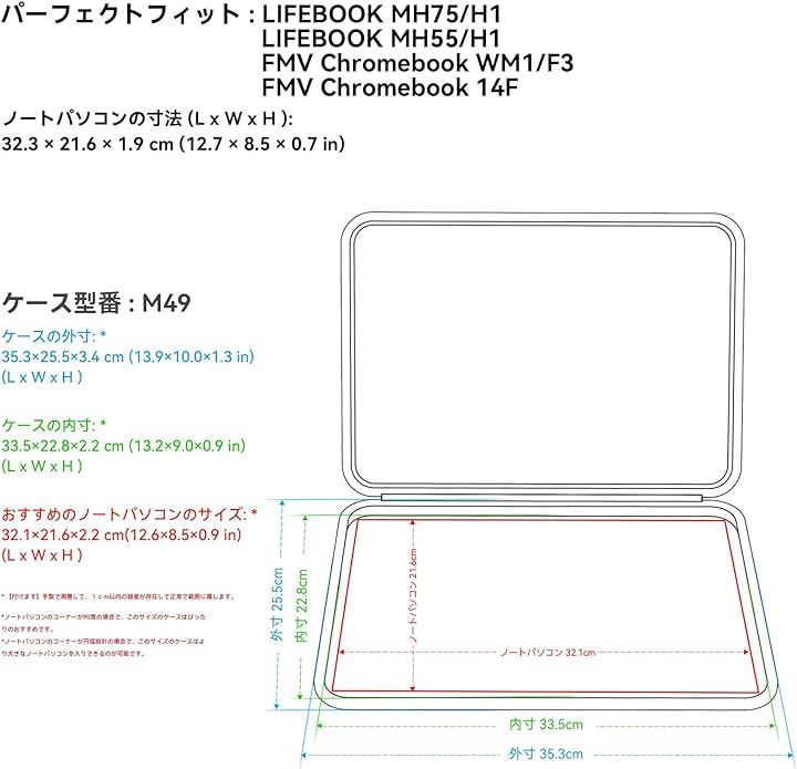 「ケースの型番:M49」外寸:35.3 x25.5 x3.4 cm(13.9 x10.0 x1.3 inch );内寸:33.5 x22.8 x2.2 cm(13.2 x9.0 x0.9 inch )。