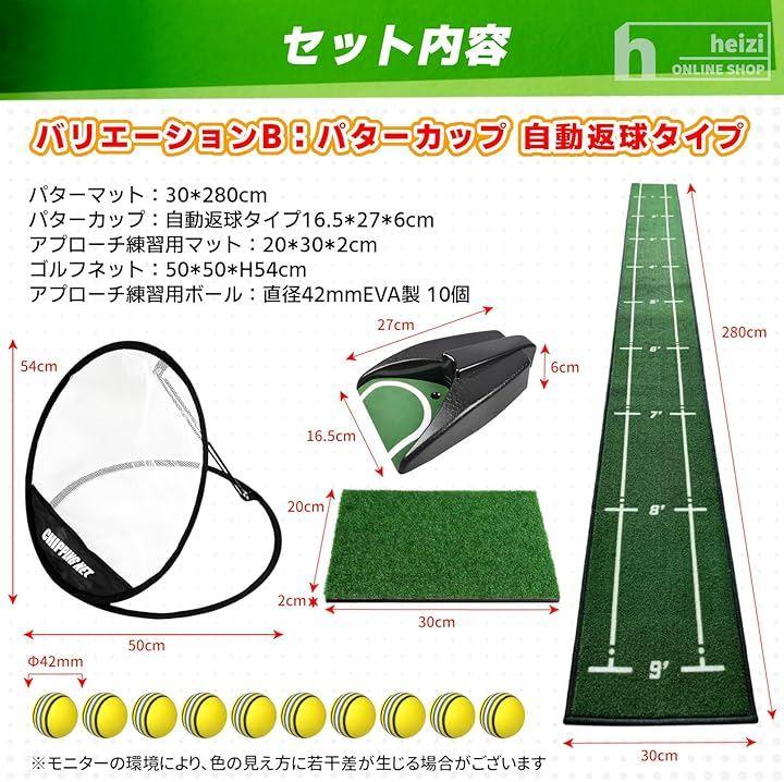 「セット内容」パターマット30x280cm・パターカップ2種類から選択可能(普通タイプ19.5x17x4cm*カップサイズ変更可能・通常時7.5cm、拡張時[内側枠取り外し時]10.8cm / 自動返球タイプ16.5x27x6cm *単3電池2本駆動)・アプローチ練習用マット20x30x2cm・ゴルフネット50x50xH54cm・アプローチ練習用ボール直径42mmEVA製 10個 計14点セット