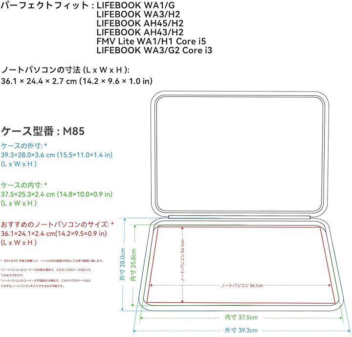 「ケースの型番:M85」外寸:39.3 x28.0 x3.6 cm(15.5 x11.0 x1.4 inch );内寸:37.5 x25.3 x2.4 cm(14.8 x10.0 x0.9inch )。