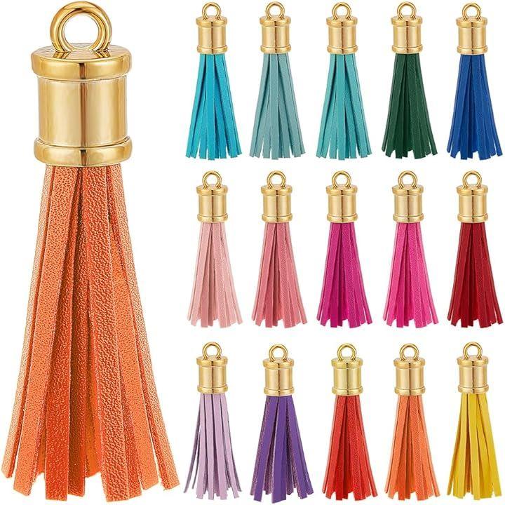 15色の鮮やかなカラー:セットには、水色、黄色、緑、紫、黒、オレンジの11色のフェイクレザータッセル15個が含まれており、各色1個ずつ入っています。