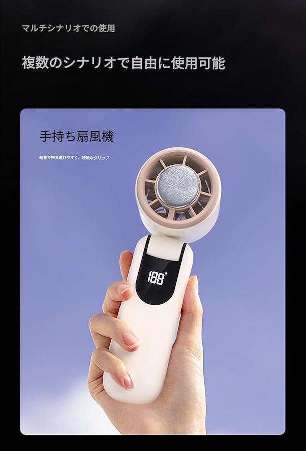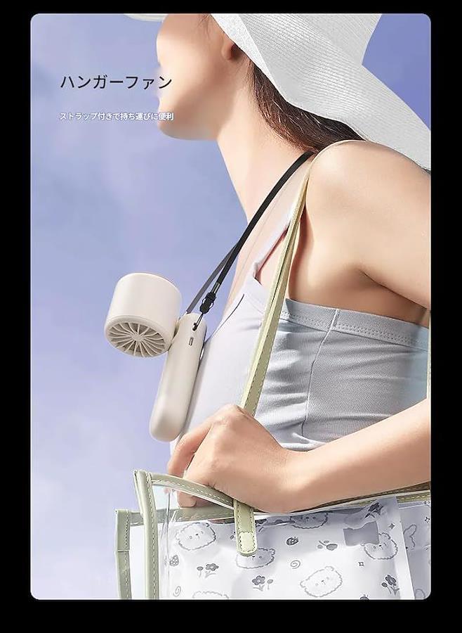 「3WAY仕様で使い方自由自在」 手持ちで使える「ハンディ」スタイル 折りたたんで「卓上扇風機」として ストラップを使って「首掛け扇風機」に どんなシーンにもフィットするファンです。