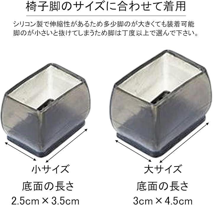 小(底面2.5cmx3.5cm)、大(底面3cmx4.5cm)と2サイズあるので、取り付け予定の椅子脚の底面のサイズを計測して下さい。