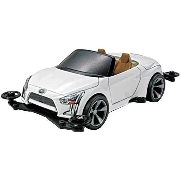 タミヤ 18081 レーサーミニ四駆シリーズ No.81 ダイハツ コペン RMZ VSシャーシ 注目のコンセプトカーが早くもミニ四駆で走り出す。シャフトドライブ四輪駆動を採用した高性能レーサーのプラスチックモデル組み立てキットです。ダイハツ コペンRMZは、ダイハツ工業が2013年の東京モーターショーに出品した2人乗り軽オープンのコンセプトカー。ボディはオープン状態をモデル化し、運転席や助手席なども立体的な仕上がり。ヘッドライトやテールライト、ノーズのエンブレム、フロントウインドウの窓枠などはステッカーで表現しました。シャーシは小型・軽量でショートホイールベースのVSを採用。リヤローラーも含めてブラックカラーとしました。また、バッテリーホルダーはヒンジで開閉でき、電池交換もスピーディー。シルバーの5本スポークホイールに、直径26mmのローハイトタイヤを装着しました。ギヤ比は4:1。モーター付き。組み立ては接着剤不要のはめ込み式。【基本スペック】完成時の全長145mm。全幅92mm。全高49mm。モーター付き。組み立ては接着剤不要のはめ込み式。【別途必要】単3形電池2本