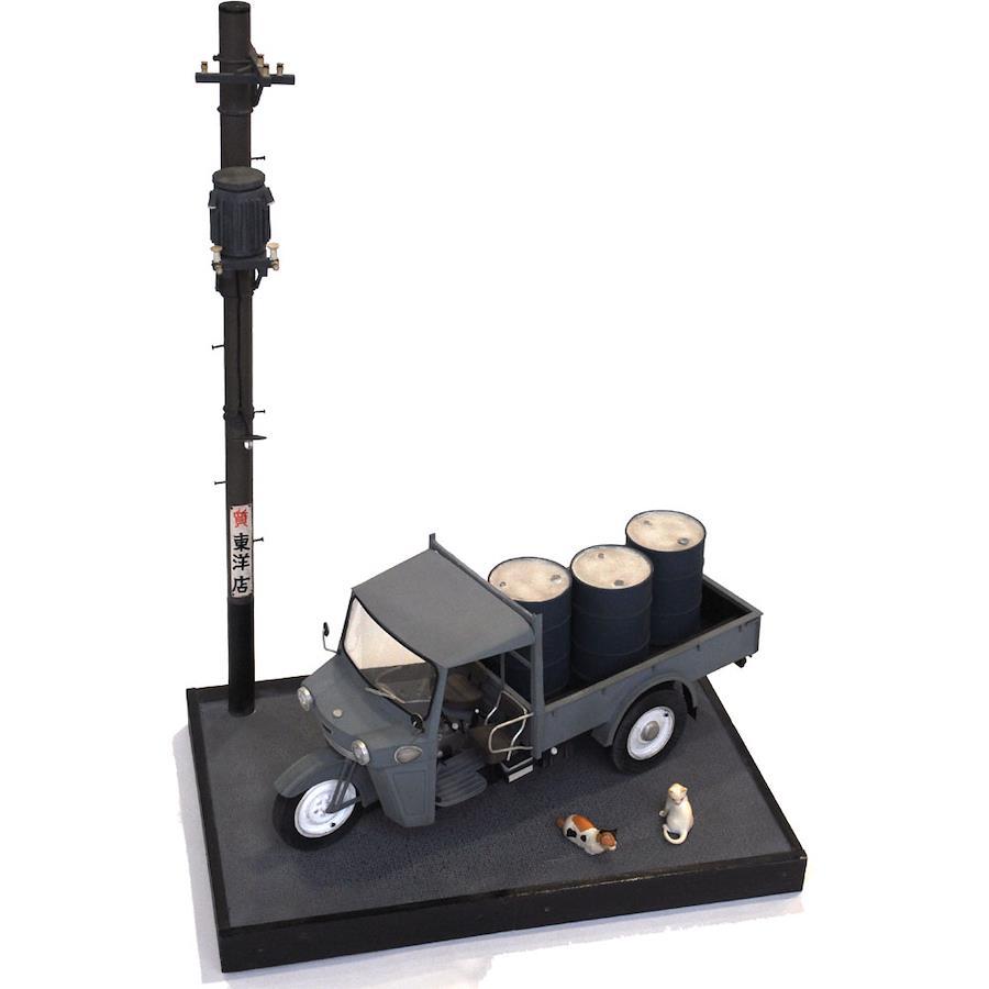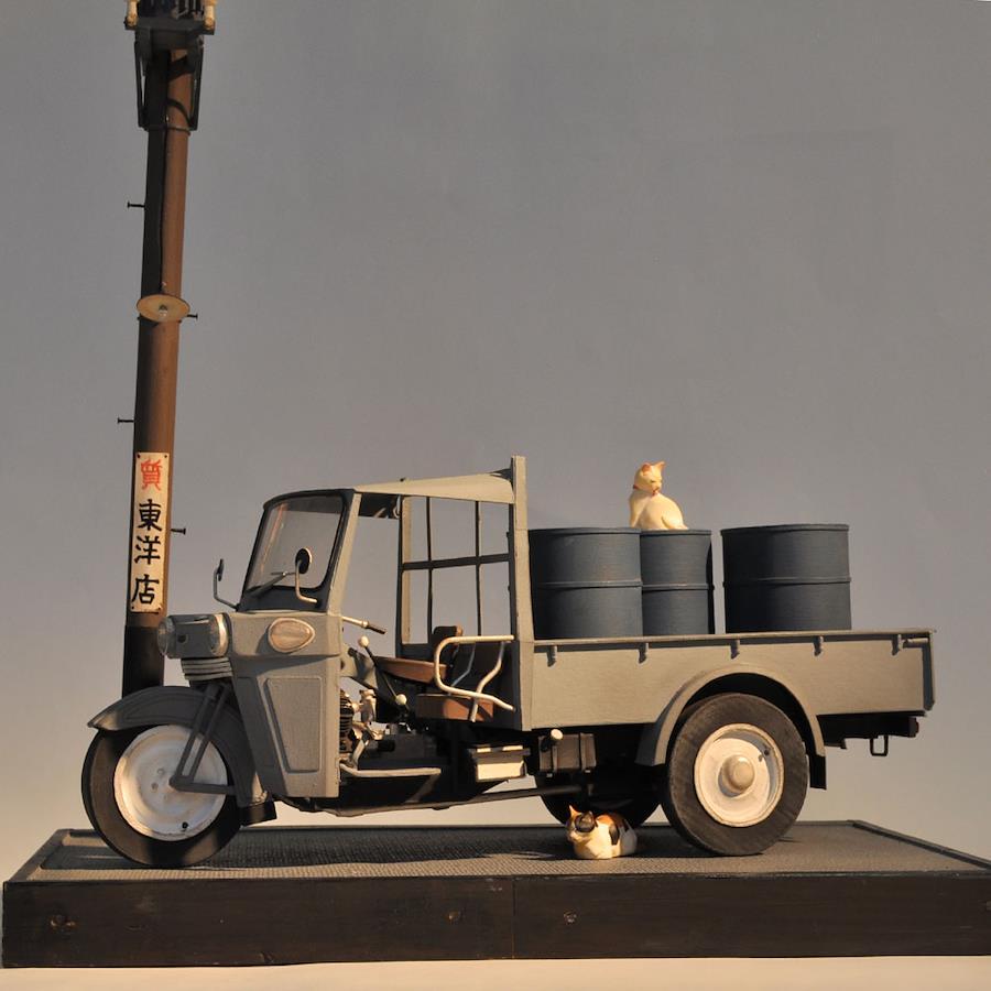 備考:クルマは紙製フルスクラッチ。ハンドル部分など一部に金属素材を使用しており、自然なサビがあります。ジオラマベースとは接着されておりません。オマケとして紙製フルスクラッチのドラム缶x3と、食玩のネコx2が付属します。お好みで配置してお楽しみください。