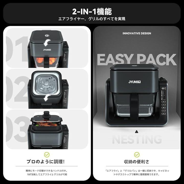 「2in1多機能 」この2in1エアフライヤーとグリルのコンボで、調理の便利さを体験できます。