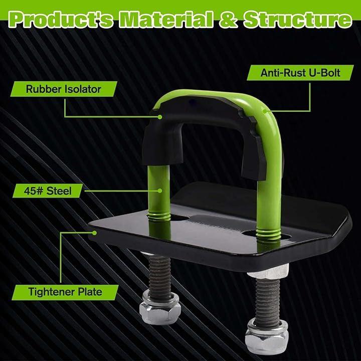 ガタガタ防止クランプは、貨物キャリア、自転車ラック、またはボートトレーラーを運搬する際の騒音と振動を低減するのに役立つゴム製アイソレータを備えています。