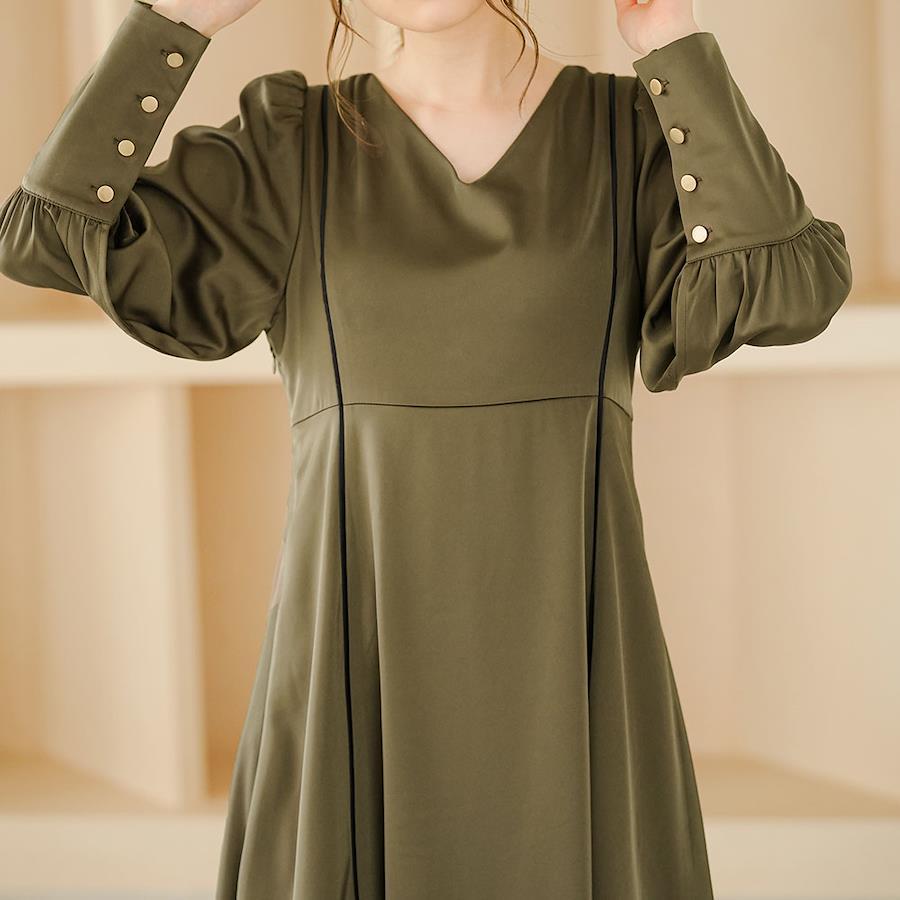 【デザイン】ハイウエスト切替+ラインの美しさにこだわり、着るだけでスタイルアップが叶うデザイン。肩~袖にはたっぷりギャザーを寄せて、かわいらしさを演出します。ボディカラーによって違うパイピング配色も、シンプルながら存在感があります。