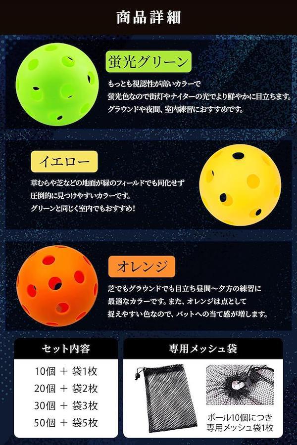 「選べるカラーボールで練習効率UP。」☑️蛍光グリーン:もっとも視認性が高いカラーで、蛍光色なので街灯やナイターの光でより鮮やかに目立ちます。