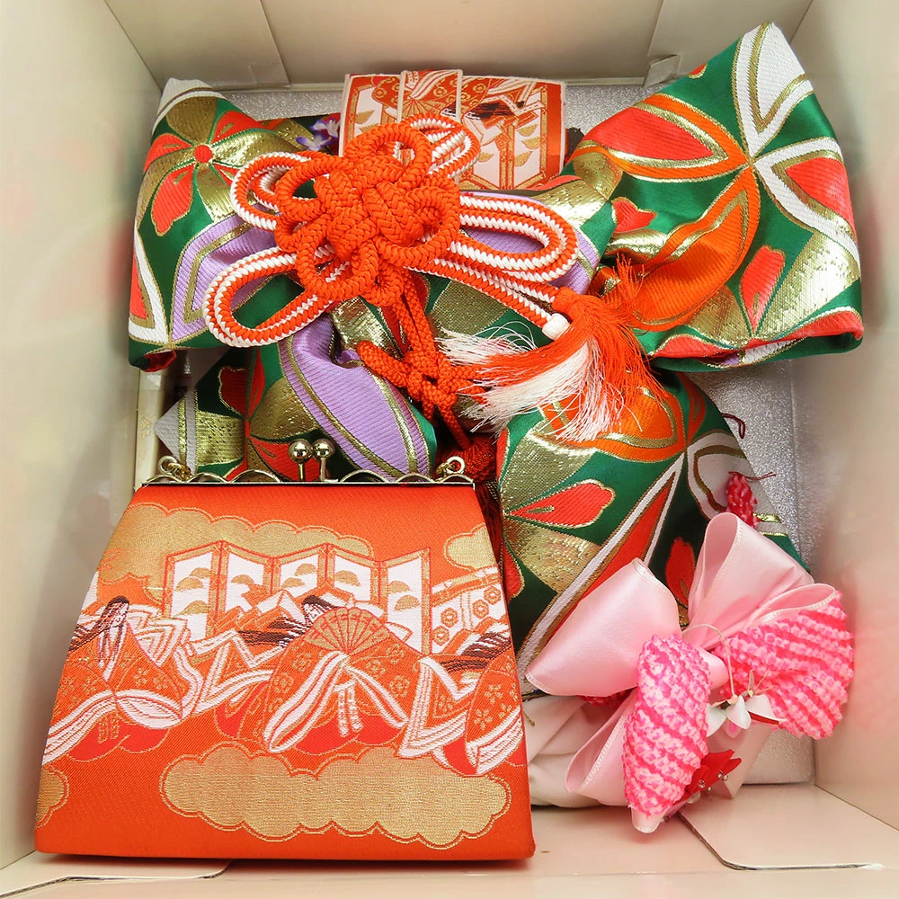 | 仕様 | 詳細備考:結び部分 縦:最長約28cm 横:最大約30cm 半えり 全長:約80cm 箱迫 縦:約6.5cm 横:約10cm 扇子(閉じた状態) 長さ:約16cm 髪飾り(大) 縦:約13cm 横:約13cm 和装バッグ 縦:約13cm 横:約15.5cm 幅:約5cm | 付属品 | 保存箱 / 結び帯 /和装バッグ /箱迫 /寿扇子(未使用品) /かんざし /かんざし入れ /髪飾り×2 /半えり(未使用品) /御守り |