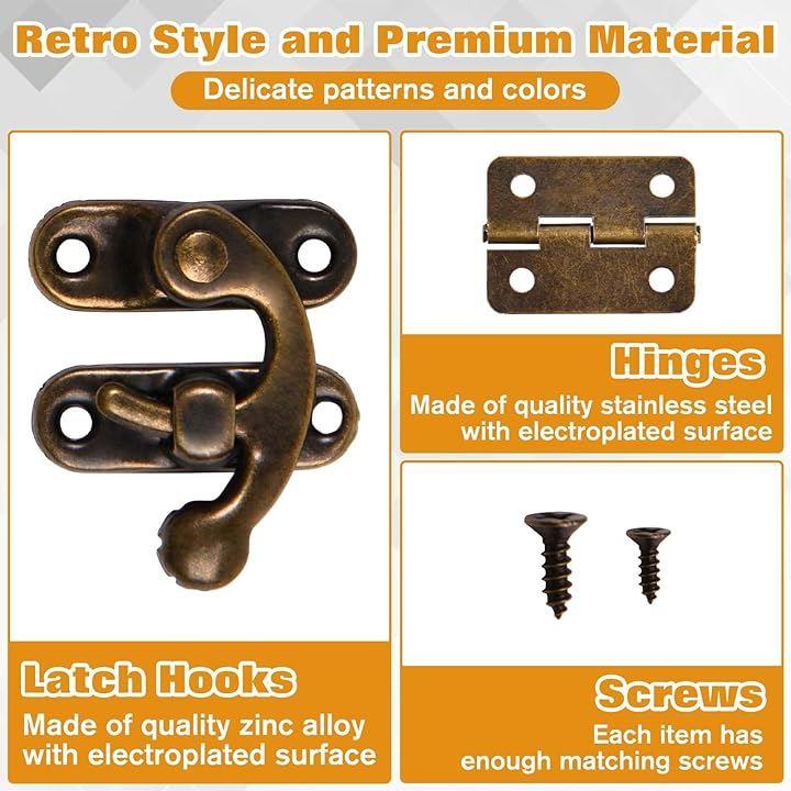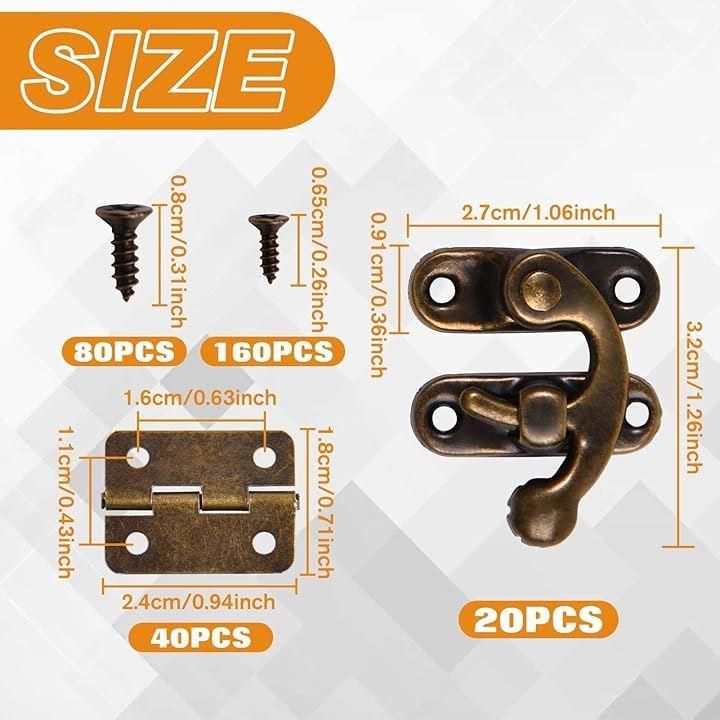 セット内容:アンティーク・ブラス・ミニヒンジ40個(6.5mm交換用ネジ付き)、アンティーク・ピンフック20個(左フック10個、右フック10個)、8mm交換用ネジ付き