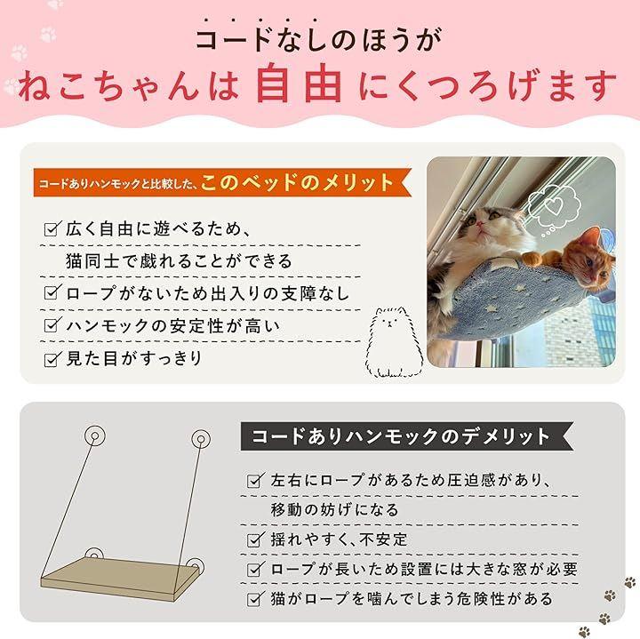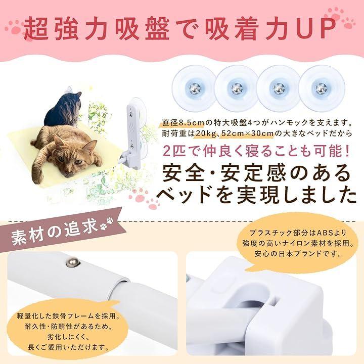 「お客様の声を元にグレードアップ。」猫ちゃんが安心してのびのびとくつろげるよう、ハンモックの端を上向きに改良しました。また、吸盤専用の強力な両面テープ9個が付属しており、さらに安定感・安心感がアップしました。