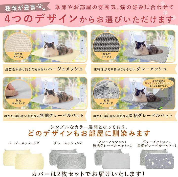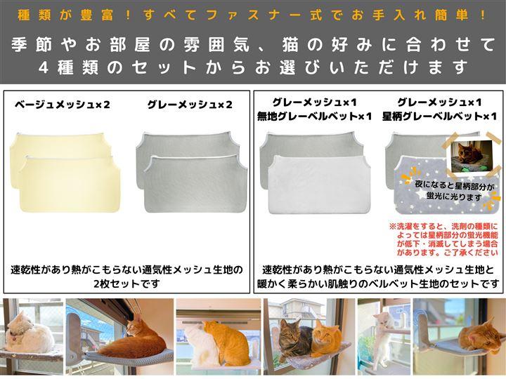 速乾性のあるメッシュ生地と暖かく柔らかい肌触りのベルベット生地の2種類があり、季節やお部屋の雰囲気、愛猫の好みに合わせて2枚お選びいただけます。