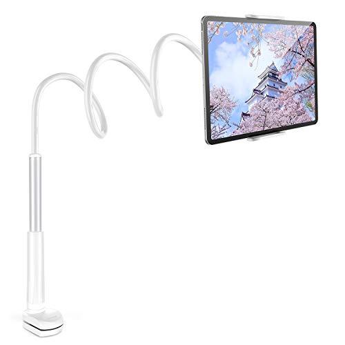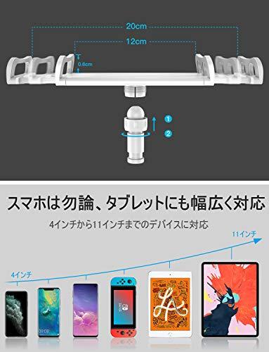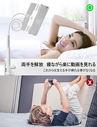 【2020業界最新改良版初登場*タブレットスタンド】オンライン授業で役立つ一品。業界タブレット スタンドの先駆者である弊社は品質にこだわり、航空用アルミ素材を採用することで、従来のタブレットスタンドが抱えていた問題点を改善し、丈夫でしっかりとした作りとなっております。新定番となるアマゾン史上最高の商品を販売します。スタンド本体の金属部分の構造も設計しており、新世代の高級感が溢れています。両手を解放して、リビングや寝室で寝そべりながら動画等を楽しめます。【タブレット&スマホ&多機種兼用】4~11インチのスマホ&タブレット等のデバイスに適用。ケースを付けても対応。【アーム延長版・360°回転で角度自由調整】業界最新改良延長版でスタンドの全長は95㎝になり、アーム部分は72.5㎝になります。お好みの向き、高さを調節することができます。どんなに曲げでも安心してご利用いただけます。タブレットを空中に設置できるのでデスク空間を有効に活用できます。 クリップにクッション材が付いているので、デバイスに傷がつきません。ホルダーの接続部分にボールジョイントを採用し、360°回転可能で角度や向きを自由に調節することができます。スマホ、タブレット等を横向きでも縦向きでも快適に使用できます。【土台強化・安定性抜群】今までのタブレットホルダーは「本体土台が割れた」「ネックが硬いのに対して土台部分が弱い」というご意見をいただきました。この新開発したホルダーは、土台の厚さを倍にすることで強度が増し、割れにくくなっております。土台の固定ホルダー部分には、滑り止めとしてEVA素材を使用しております。しっかりと固定されますが、土台設置箇所に傷が付く心配はございません。【充電しながら使用可能・デバイスに優しい設計】スタンドの両端に穴があるため、イヤホンやUSBケーブルを差し込むことができます。スマホやタブレットで動画、ゲームを楽しんでいる場合に電源が切れることがなくなります。タブレットを手で持つ代わりに固定することが出来るので、長時間快適に楽しむことができます。360度回転可能、クランプ式で自由な位置にiPadをしっかりと固定できる。ホルダーのアームはある程度の硬さが必要なので、角度を調整する時に力を入れる必要があります。