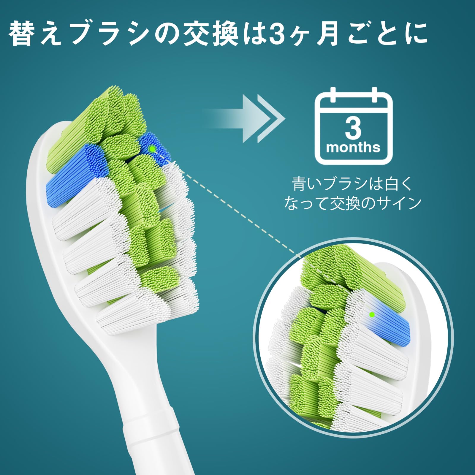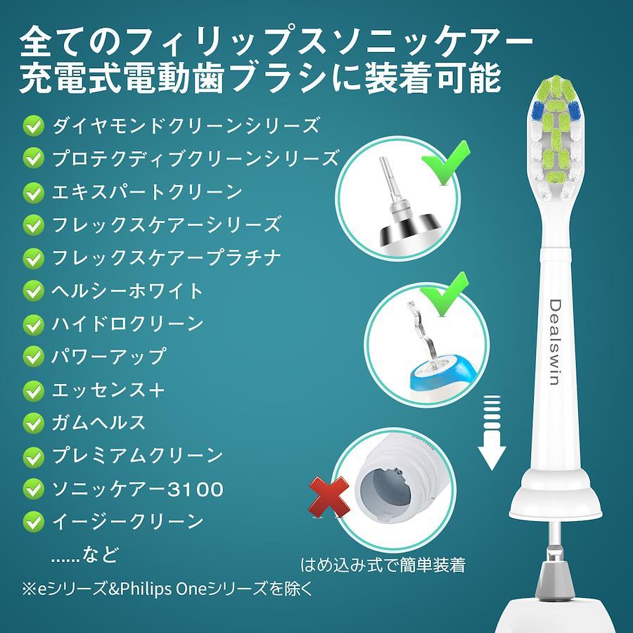 【手動歯ブラシより8倍の歯垢除去】ブラッシング接触面積を最大化にして、密集した毛先のステイン除去パッドが、表面の8倍の歯垢を簡単に取り除きるだけなく、波状な毛先デザインで、歯に完璧にフィットし、歯間部にも届きやすく、効果的に歯間の歯垢除去ができます。 【幅広い互換性】Dealswin 電動歯ブラシ 替えブラシはダイヤモンドクリーン、プロテクトクリーン、イージークリーン、ハイドロクリーン、ヘルシーホワイト、フレックスケアシリーズ、ガムヘルス、プラークコントロール、クリーンケアー、プレミアムクリーン、プラチナシリーズ...などすべてののブラシヘッドは、全てのフィリップス ソニッケアー 電動歯ブラシでお使いいただけます。(*注意:eシリーズ&Philips Oneシリーズには対応できません) 【優れた素材&歯茎の健康を守る】米国DuPont素材(デュポンナイロン)で作られたフィリップス ソニッケアー電動歯ブラシ用替ブラシです!磨耗しにくく、耐久性が優れているのはもちろん、強力に歯垢を除去できます。また、毛先1本1本を丸めた高精度なラウンド加工を施していますので、歯面や歯肉にやさしく、安心してご利用いただけます。 【衛生カバー&交換リマインダ】ソニッケアー用 の替えブラシは衛生カバーが付属して、ブラシ毛の形を維持して、ほこりや細菌の侵害を免れることもできます。また、変色毛を採用しているので、青いブラシの毛は徐々にフェードし、1/3が白くなると、3ヶ月以内に歯ブラシのヘッドを交換することをお勧めします。 【100% 満足保証】当社のポリシーは、「顧客満足は常に最優先事項です」であり、何かご疑問やご使用中不具合などがございましたら、直接に弊店にご連絡ください。(連絡方法: [アカウントサービス]?[注文履歴]?[出品者に連絡する]