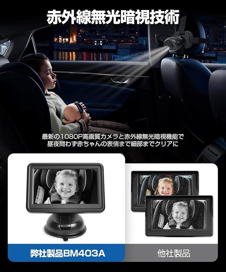 BM403Aモニターは800x480pixelの高解像度のIPSパネルを採用し、最新のAHD技術で1920x1080のフルHD映像を実現し、車内の赤ちゃんの様子を鮮明に映し出します。