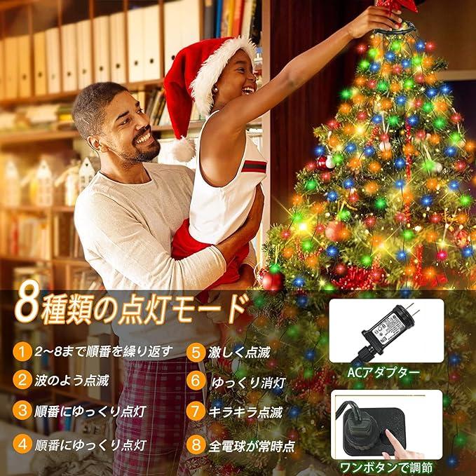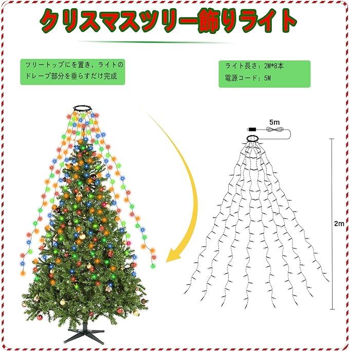 ■商品説明?【クリスマスツリー飾りライト】クリスマスツリー飾り専門に設計のライトです。長さ:8本*2mの垂れ下がるワイヤライトで280個電球があります。ウォームホワイトの発光色で、ロマンチックな癒しの雰囲気を作り出します。本商品イルミネーションライトはAC給電式で、普通のソーラー式ライトより輝度が高いく雰囲気を盛り上げます。ソーラー式の点灯時間と違い、曇りや雨、雪の日にもこの飾りライトはお必要に応じて一晩中、或いは毎日24時間点灯しても実現できます。また電池式イルミネーションの速く電池消耗もなくて経済的です。?【8点灯パターン・モード記憶可能】①2~8まで順番を繰り返す②波のよう点滅③順番にゆっくり点灯 ④順番にゆっくり点灯して、ゆっくり消える⑤激しく点滅⑥ダブルライトゆっくり点灯しゆっくり消える⑦キラキラ点滅⑧全電球が常時点灯【柔軟性・屋内屋外兼用】頑丈な銅線を使用しており、断線の心配はありません。自由自在に折り曲げられます。お好きな形を手軽に作れます。またモード記憶機能も付き、ライトの電源を切っても、次回も前回と同じ点灯モードで光ります。?【取り付け簡単・IP44防水】ライトストリングの点灯変化はACアダプター上のボタンからON/OFFとパターンを調整します。ボタンを押すだけで簡単に切り替えが可能です。ストリングライト設置するときは、ツリートップに緑色のプラスチックリングを置き、ライトのドレープ部分を垂らすだけ完成です。屋外でも使用可能、ライト部はIP44の高い防水レベルも備えて、水が怖くないで、雨など悪天候でも平気に使えます。?【PSE認証済み・30V安全低電圧】このled イルミネーションライトは電気用品安全法準拠(PSE取得済)日本の電気安全法に基づく技術基準に適合しますので、ご安心にお使いください。またストレート イルミネーションライトはACコンセントから取り外しも可能で、同じ製品を複数連結してもピカピカに点灯できます。それで、業務用の装飾ストリングライトとして最適です。30V安全低電圧、長時間使用しても安全です。過熱やケガを心配することなく、省エネ、低消費電力で、寿命が長いです。?【幅広い実用性】ご家庭やお店、広場やパーティ会場を綺麗に彩ります。リスマスツリーやガーデンツリーの飾り付けはもちろん、インテリアや結婚式、パーティーなど幅広くご利用いただけます。 どんな装飾スキームにも合うように簡単に取り付けられます。 あなたの空間を美しい童話の世界に変えましょう。友人、親戚、同僚への美しい贈り物になります。「Kimoinsa」はメーカー直営店として、で販売しております。ご注文の際に、「Kimoinsaメーカー直営店」の販売元をご確認の上行えてください。万が一初期不良(異なる製品届き、破損、中身不足)、通常使用による品質問題がある場合、ぜひ「注文履歴→販売元→質問する」の方法を通じて、メールにてご連絡ください。?24時間以内迅速なご対応させていただきます??もっと見る